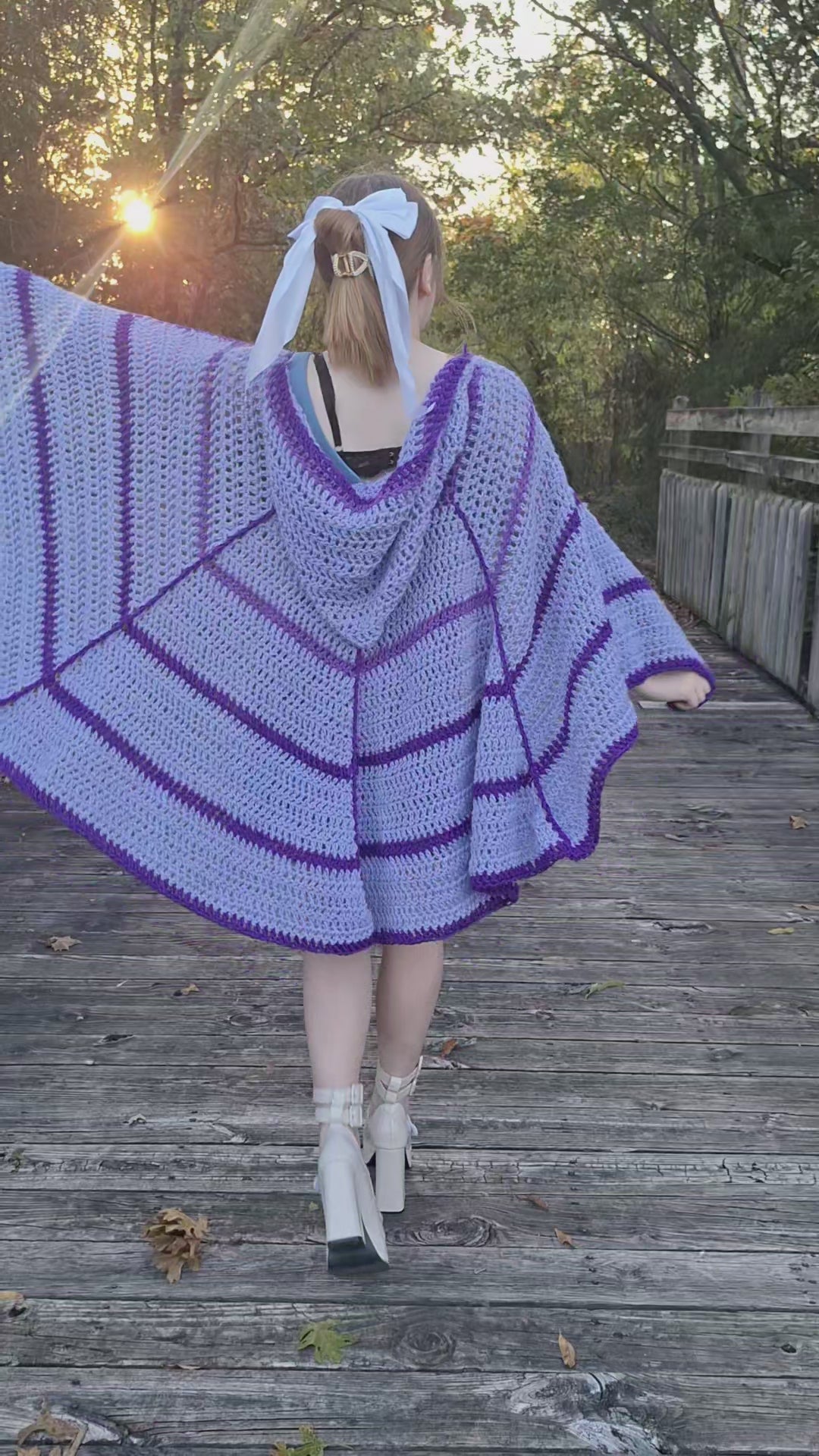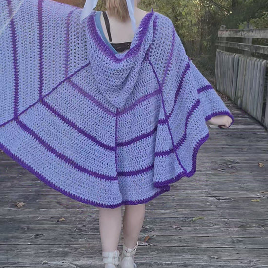 Crafted in soft light purple yarn with deep violet accents, this cape drapes beautifully and shimmers with cozy gothic charm. The hood adds a dramatic touch — perfect for chilly nights, witchy wardrobes, or anyone who loves a statement piece that feels straight out of a fairytale.
